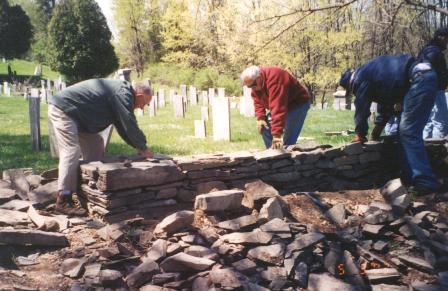 Dry Laid Stone Wall Reconstruction (September, 2005) with Ray Krumenacker, master stone mason at the Quitman House. Participants learned: tools of the trade and their uses, ripping down and organizing materials, setting stone bases and stone wall construction, and capping or topping the stone wall.